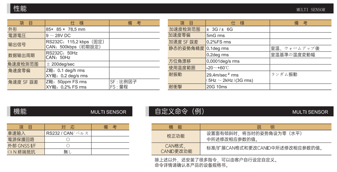 • MULTI SENSOR由3軸陀螺儀(Z軸由i-FOG、 X和Y軸由MEMS陀螺儀)和加速度計構(gòu)成,檢測角速度和加速度,進(jìn)而計算姿勢角(滾轉(zhuǎn)角、俯仰角)和方位角。